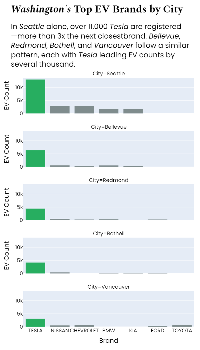 df_wa = df[df['State'] == 'WA']Tesla Takes the Wheel: Brand Comparisons and EV Adoption in Washington