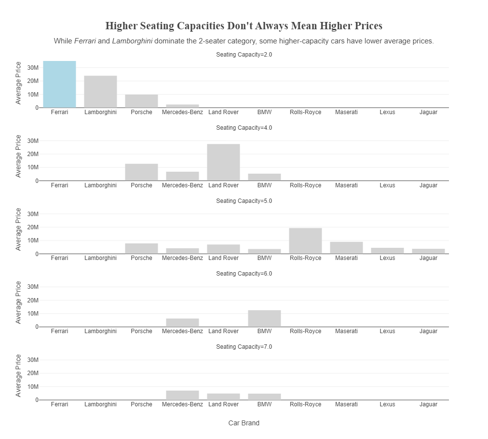 This chart segments car prices based on seating capacity, revealing that higher seating capacities do not necessarily lead to higher prices.