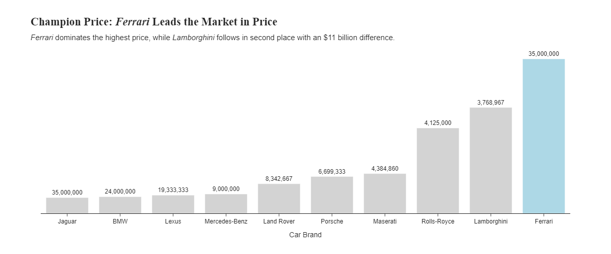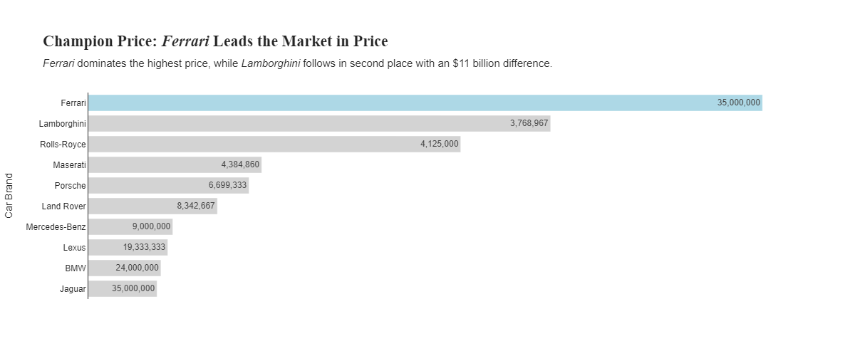 This horizontal bar chart highlights Ferrari as the most expensive car brand, with a significant price gap of $11 million above its closest competitor, Lamborghini.