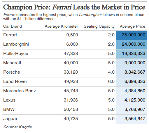 This table presents key specifications of luxury car brands, including their average price, mileage, and seating capacity.
