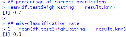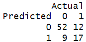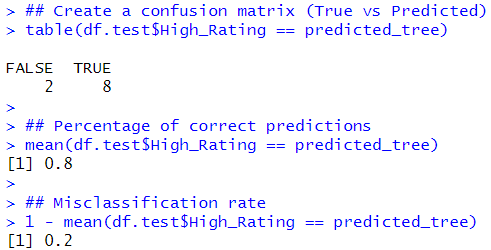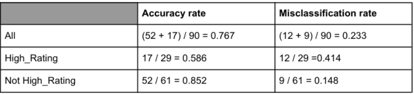 Out of 61 not High_Rating movies, there are 52 correct predictions (true negatives) and 9 misclassifications (false positives). Out of 29 High_Rating movies, there are 17 correct predictions (true positives) and 12 misclassifications (false negatives). The accuracy rate is 76.7%, and the misclassification rate is 23.3%.