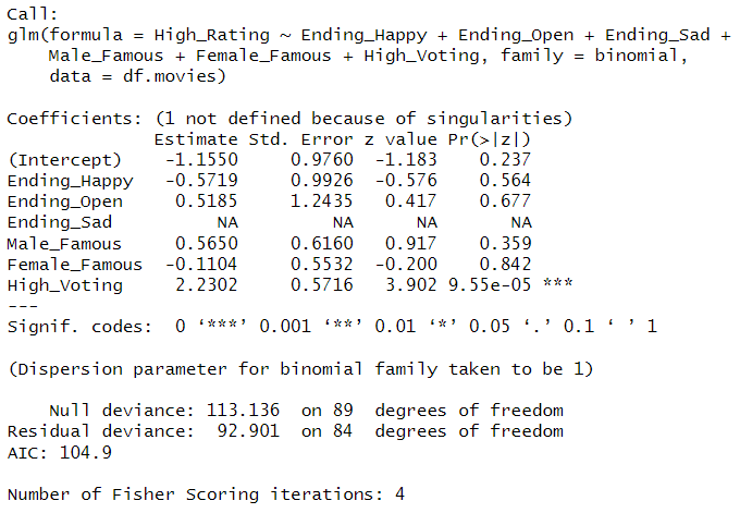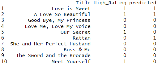 This algorithm has features as Ending_Happy, Ending_Open, Ending_Sad, Male_Famous, Female_Famous, and High_Voting to predict High_Rating. The model is built in R and the result is as below: