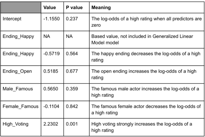 log( p̂ / (1 - p̂) ) = -1.1550 - 0.5719 × Ending_Happy + 0.5185 × Ending_Open + 0.5650 × Male_Famous - 0.1104 × Female_Famous + 2.2302 × High_Voting
