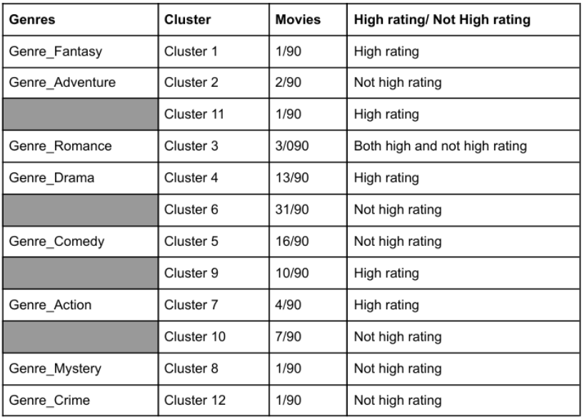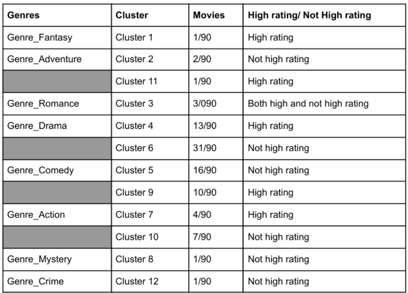 The genre grouping uses features as Genre_Comedy, Genre_Drama, Genre_Crime, Genre_Romance, Genre_Action, Genre_Adventure, Genre_Mystery, Genre_Fantasy, and High_Rating, with k = 12. The cluster sometimes does not make sense, for example, Cluster 3 - Genre_Romance has both high and not high ratings.