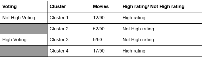 The genre grouping uses features such as High_Voting, High_Rating, with k = 4. There is consistent evidence that movies with high voting tend to have high ratings and vice versa. However, low voting seems to impact ratings more than high voting.