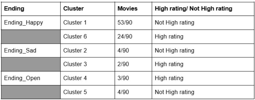 The genre grouping uses features such as Ending_Happy, Ending_Sad, Ending_Open, and High_Rating, with k = 6. It is evident that movies with happy endings tend to have lower ratings. However, sad and open endings show no significant difference in their high-rating percentages.